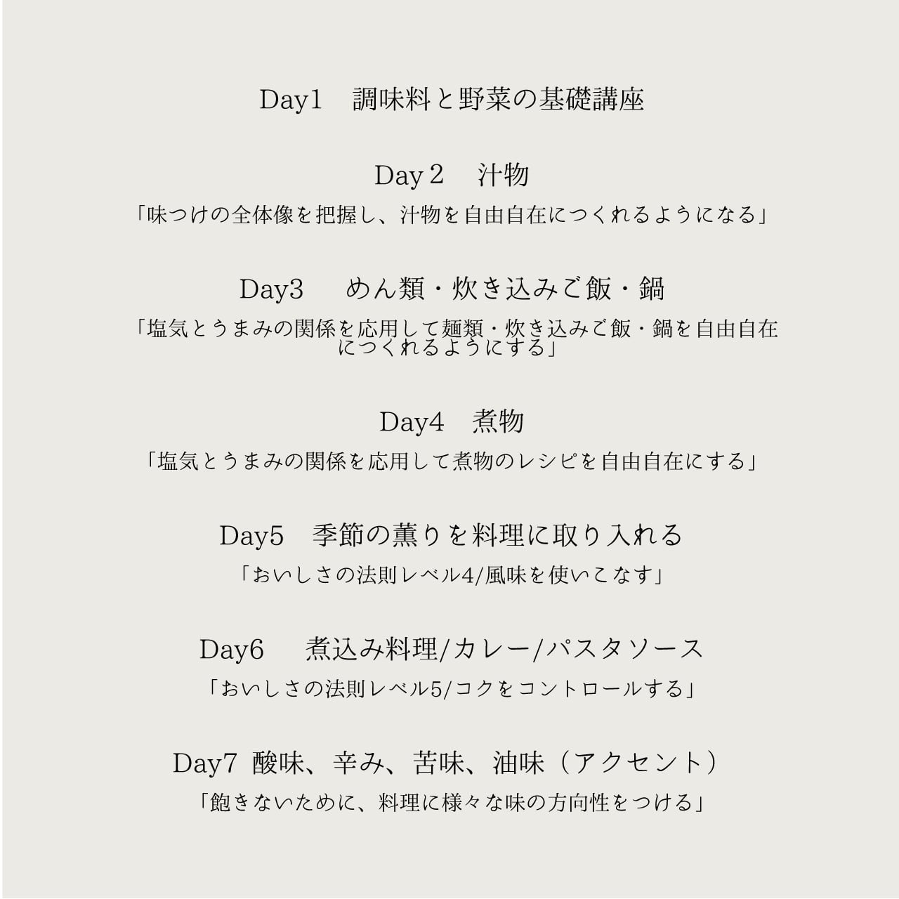 旨味・塩気・風味・コク・辛味など、全ての味の関係性を示したおいしさの法則の全体像を掴むと同時に実際にどういうことなのかお吸い物を通して全味でバランスを取り、実感します。またおいしさの法則の大基本であるレベル1ー3に関して深めていきます。(200レシピ)