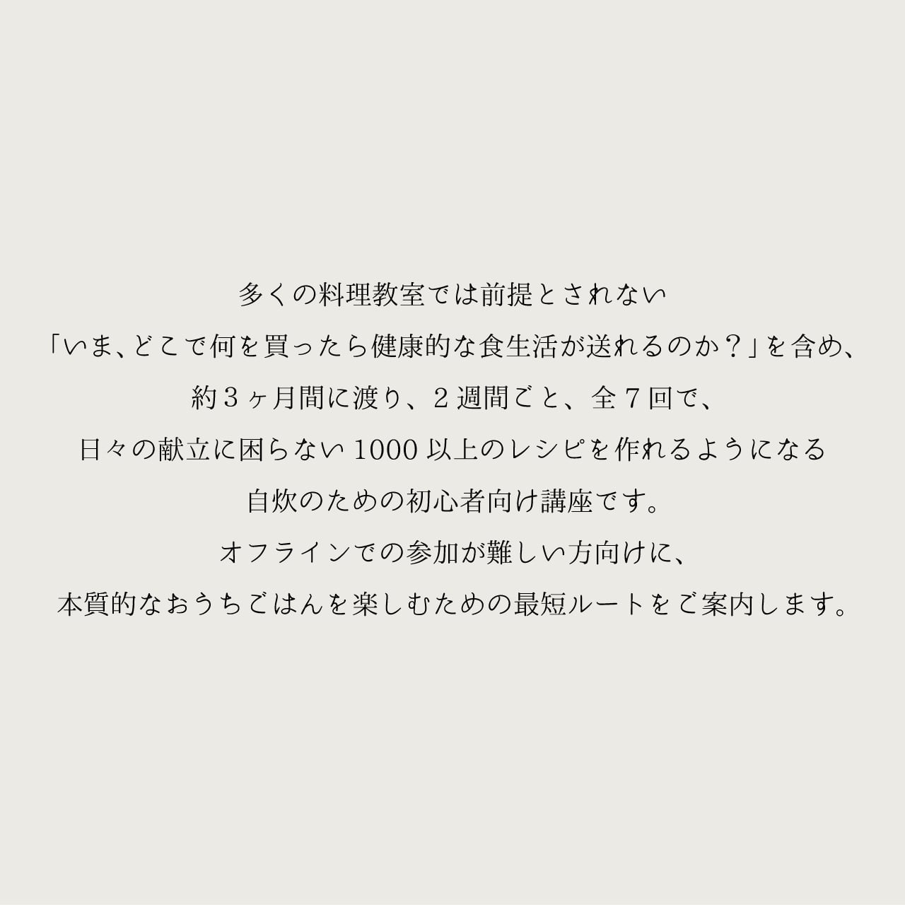 多くの教室では100回以上通わないと実感できないエッセンスを全7回に凝縮し、自炊を楽しむための最短ルートをご案内します。料理教室に通っても上達した実感のない方にもオススメです。